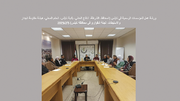 - مجموعة بؤرية مع المؤسسات الرسمية، شملت مداخلة لعطوفة محافظ نابلس السيد غسان دغلس وممثلين عن الدفاع المدني، الشرطة، بلدية نابلس، وهيئة مقاومة الجدار لمناقشة جاهزيتهم وآليات التنسيق واحتياجات التعزيز لضمان استجابة فعالة لحالات الطوارئ.